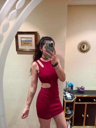 Vestido corto de color burdeos con un diseño moderno y atrevido. - Escote asimétrico con tirantes. - Aberturas laterales. - Corte ajustado.