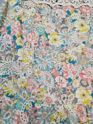 Vestido de verano con un diseño fresco y delicado, perfecto para ocasiones informales. - Detalle de flores aplicadas en el escote y hombro. - Encaje y texturas en la parte superior. - Tejido ligero y transpirable.