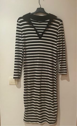 Vestido de canalé gris de Bershka. - Diseño ajustado. - Manga media. - Estampado 100k FOLLOWERS FOLLOWING NO ONE en el pecho.