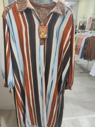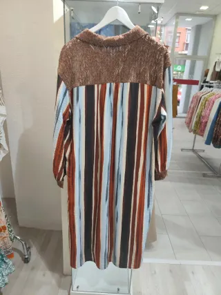 Vestido camisero de algodón con un diseño de rayas vibrantes. Es una prenda versátil y cómoda. Sisa 58 largo 118. Vale para talla M. Bolsillos laterales - Material: Algodón. - Diseño: Rayas verticales en varios tonos.