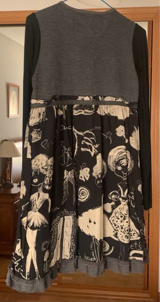 Vestido con un diseño único y detalles llamativos. - Mangas largas en color negro. - Cuerpo superior con tejido de cuadros grises. - Falda con estampado de figuras y motivos. - Volantes en el bajo.