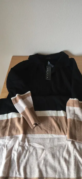 Conjunto de dos prendas de ropa para mujer. - Prenda superior de color rojo-granate con cremallera. Dos lazadas a los lados de color negro. Talla S un poquito grande. - Vestido de manga larga con estampado de rayas. Por encima de la rodilla. Bershka. Talla S grande. Envío disponible y entrega personal en Madrid.