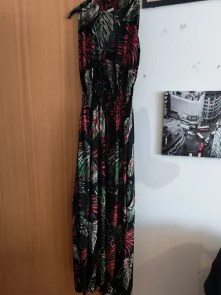Vestido largo con un estampado tropical vibrante. Ideal para ocasiones informales o de verano. - Diseño de cuello halter. - Cintura elástica con volantes. - Falda larga y fluida.