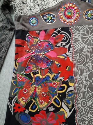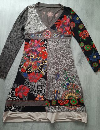 Vestido de la marca Desigual con un llamativo estampado. - Diseño con escote en V. - Mangas largas con detalle. - Corte evasé. Escucho ofertas razonables.