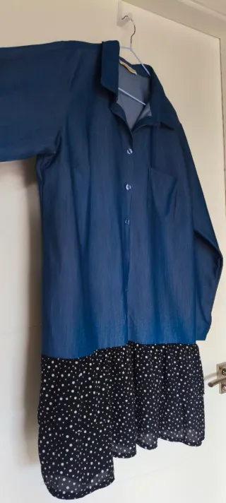 Vestido camisero con doble textura, fluido y de tejido fino. Ideal para cualquier ocasión. Tiene una roce, a penas se nota puesto (ver fotos) de ahí su precio económico. - Estilo vaquero muy bonito - Diseño camisero. - Combinación de dos texturas. - Tejido ligero y transpirable