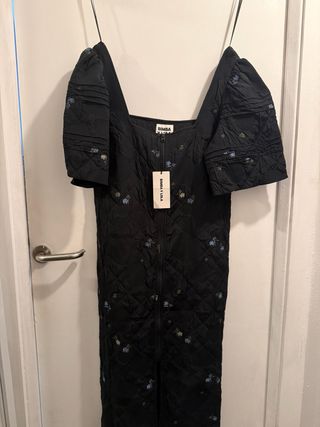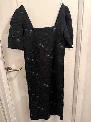 Vestido de Bimba y Lola con un diseño elegante y detalles florales. - Color negro con bordados multicolores. - Tejido con textura acolchada. - Mangas abullonadas. - Escote cuadrado. - Cremallera frontal.