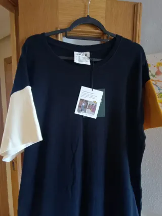 Vestido de la marca Skunfunk, con un diseño moderno y bloques de color. - Mangas cortas en color crema y ocre. - Cuerpo principal en negro. - Parte inferior en azul vibrante. - Talla XL.