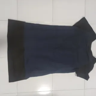 Vestido casual con un diseño moderno y cómodo. - Combinación de colores azul y negro. - Corte recto y manga corta.