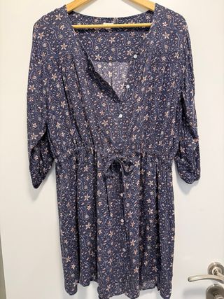 Vestido de la marca Natura con un estampado floral en tonos azules y rosados. Presenta un diseño con cuello en V y cierre de botones. - Cintura elástica con cordón ajustable. - Mangas tres cuartos. - Largo hasta la rodilla. Perfecto estado Impecable Chica Largo vestido 85cm Sisa a sisa 63-64cm Largo manga 43cm Chica joven
