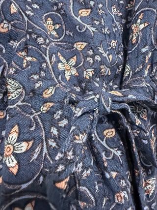Vestido de tela fina, color azul marino con estampado de flores. Media manga. Talla S/M. De largo mide 82 cm y de sisa a sisa 46. Marca S@W. Escote con detalle.