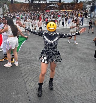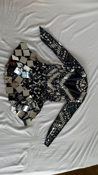 Vestido llamativo con diseño único, perfecto para festivales. - Diseño con lentejuelas y detalles metálicos. - Manga larga. - Cuello alto.
