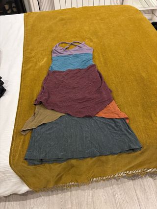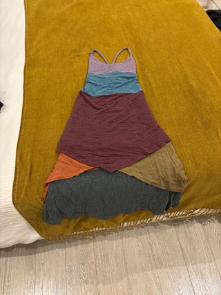 Vestido de estilo vintage con un diseño multicolor y tirantes cruzados. Muy versatil , informal o evento segun accesorios. Usado en 2 eventos solamente . - Diseño de capas con forro - Tejido ligero con brillos sutiles.