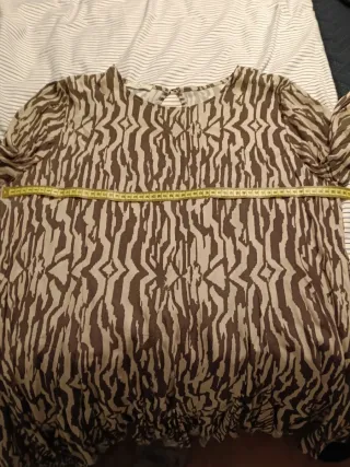 Vestido de viscosa con mangas de tres cuartos y un llamativo estampado. De axila a axila mide 46 cm y de largo 85 - Diseño de corte recto. - Cuello redondo con detalle. - Tejido fluido y ligero. Descuento del 10% en dos o más artículos de mis anuncios y 25% a partir de 5