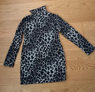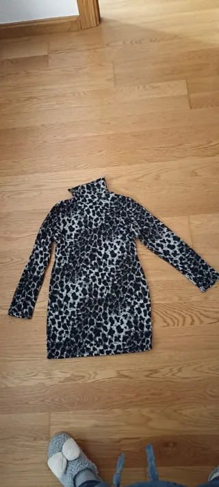 Vestido con estampado de leopardo y cuello alto. Pone talla L pero talla muy pequeño, S/36. - Diseño de manga larga. - Largo hasta medio muslo