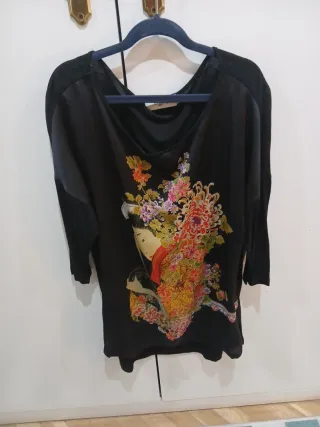 Vestido de la marca Desigual con un estampado vibrante. Diseño con escote redondo. Manga corta y largo hasta la rodilla. Aunque indica una XL la talla corresponde más a una L (referencia de la modelo: M)