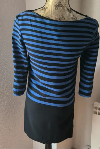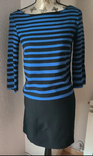 Vestido con diseño de rayas horizontales azules en la parte de arriba y color negro en la parte de abajo. Talla XS. MNG Collection. pecho 43, largo 88 aprox. Muy buen estado