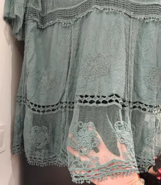 Vestido de SHEIN con un diseño en encaje y transparencias. Perfecto para ir a la playa. Es talla unica pero es una talla M-L - Mangas cortas acampanadas. - Escote en V. - Detalle de corte en la cintura. - Varios niveles con diferentes tipos de encaje y puntillas.