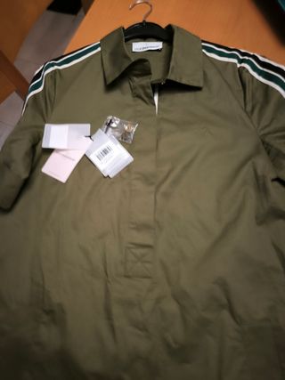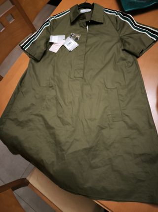 Vestido de la marca Lola Casademunt en color verde oliva. - Diseño con rayas deportivas en las mangas. - Cuello tipo polo. - Bolsillos frontales.