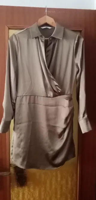 Color mostaza con rayitas muy finas blancas. Talla M. Abotonado y anudado a la cintura. Usado una vez