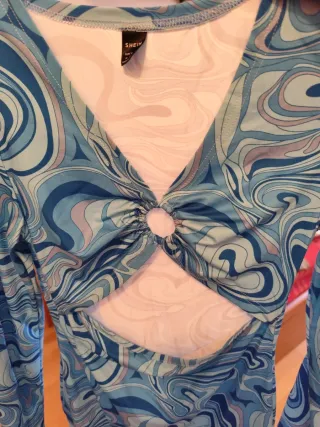 Vestido de Stradivarius con un llamativo estampado de ondas en tonos beige y gris. Usado una vez