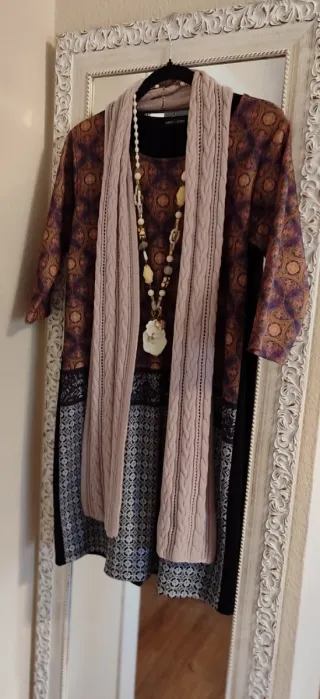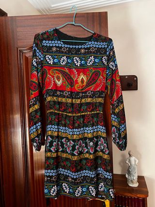 Vestido con un llamativo estampado de estilo bohemio. - Diseño de manga larga. - Cintura elástica para un mejor ajuste. - Largo hasta la rodilla. - Tejido ligero y fluido.