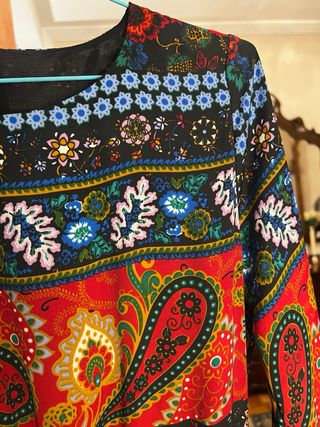 ¡Ideal para un look boho-chic diario! 🌸 Es súper cómodo y favorecedor gracias a su cintura elástica que estiliza muchísimo. 🤝 ¡Haz una oferta! 🏷️ Marca: Sfera Casual ⚙️ Material: Gasa vaporosa con forro interior 🎨 Colores: Fondo marino con flores ocres y verdes 💎 Calidad: 9/10 🛍️ Precio tienda: aprox. 26€ ❌ Desperfectos: Etiqueta interior de composición cortada (no pica). 📏 Talla: M 🚚 Envíos Rápidos: 24/48 horas. 📦 Empaquetado seguro. 💬 Atención: Respondo rápido, ¡No dudes en preguntar! ✨ Estado muy bueno. Tejido ligero que no se arruga. 👗 Queda increíble con botas cowboy y una cazadora vaquera o biker.