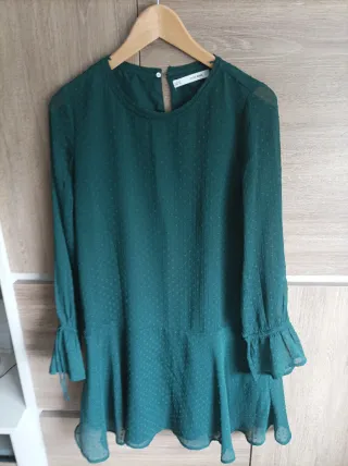 Vestido de manga larga con un diseño elegante y moderno. - Tejido ligero con estampado de topos. - Corte evasé con volantes en el bajo. - Mangas abullonadas con detalle de lazada en los puños. Talla L