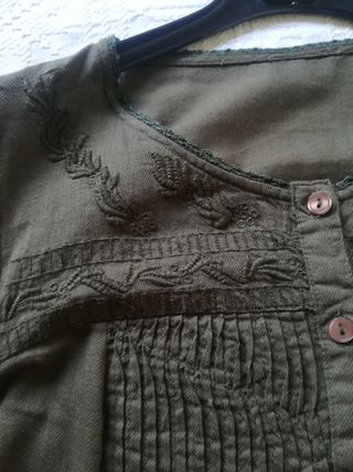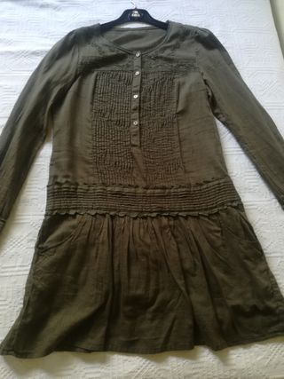 Vestido color verde con bordados, botonadura delantera y en las mangas, y con bolsillos. Talla M. Usado, pero muy poco, en un par de ocasiones. Tengo más cosas en mi perfil!!