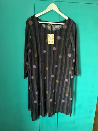 Vestido con un llamativo estampado étnico en tonos multicolor sobre fondo negro. Su diseño es moderno y original Largo 93, ancho 36, mangas murciélago SOLO ENVIO - Mangas largas. - Corte holgado.
