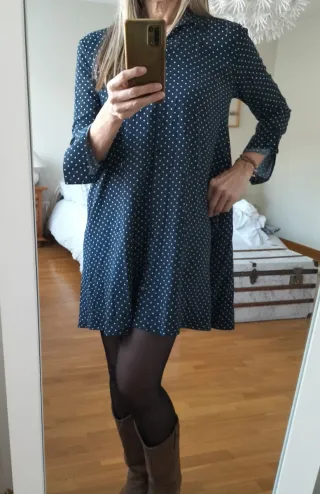 Vestido camisero corto con estampado de lunares. - Diseño de lunares blancos sobre fondo azul. - Corte camisero. - Manga larga ✓ Cierre botones