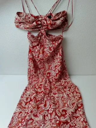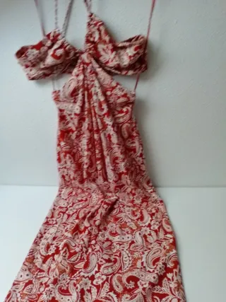 Vestido largo con un bonito estampado paisley en tonos terracota y beige. - Diseño con escote halter y tirantes finos. - Corte fluido y ligero. - Ideal para ocasiones informales o eventos de verano.