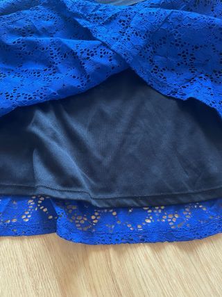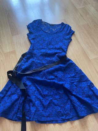 Vestido de encaje azul de la marca Morgan. Tiene un cinturón negro. - Diseño de encaje floral. - Manga corta. - Corte evasé.