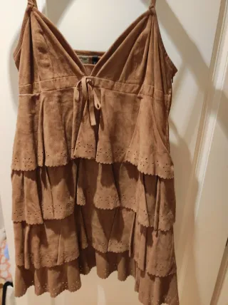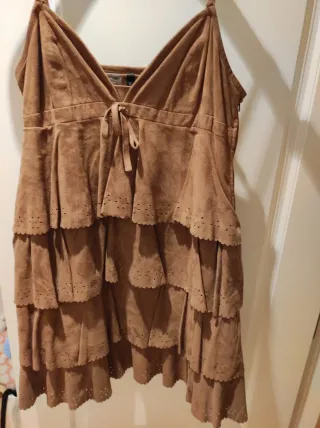 Vestido de ante muy favorecedor con un diseño de volantes escalonados y detalles calados.Queda ideal con una cazadora encima y por supuesto solo - Material: Ante - Color: Marrón - Diseño: Volantes escalonados - Detalles: Calados en los bordes de los volantes - Cierre: Cremallera lateral - Escote: Pico con lazada