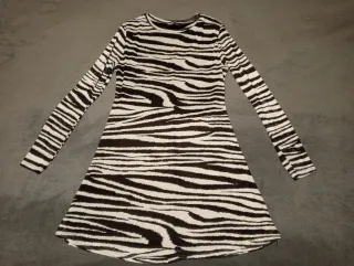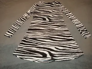 Vestido de punto con un llamativo estampado de cebra. - Diseño de cuello alto. - Manga larga. - Largo hasta el tobillo. - Talla pequeño, como una M