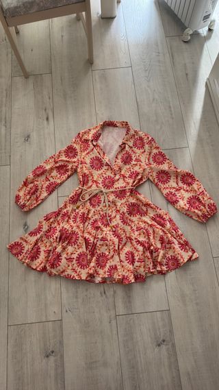 Vestido de la marca Minueto con un estampado divertido de estrellas y rayos en varios colores. El vestido tiene un corte camisero y una goma en la cintura para ajustarlo. - Diseño estampado de estrellas y rayos. - Cierre de botones. - Goma elástica en la cintura. El vestido rojo de estrellas es corte recto con muy buena caída y favorece un montón. - Vestido ajustado con original estampado, sin estrenar, con etiqueta. - Conjunto de falda de polipiel con camisa talla S único uso. Por separado 20€ cada conjunto Todo 50 euros. Posibilidad de descuento si te llevas varios, aunque no sean todos.