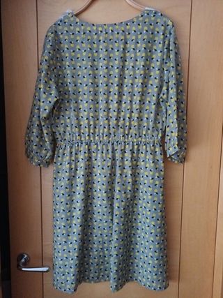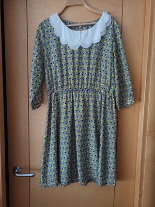 Tipo baby doll. gris con manzanas en amarillo. largo por encima de la rodilla. fluido.