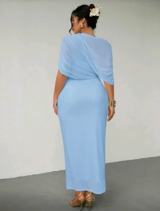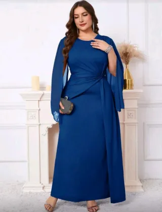Vestido largo y formal, de talla grande, confeccionado en gasa con un diseño drapeado frontal y mangas acampanadas que parecen una capa. TOTALMENTE NUEVO Hombro: 42 cm Pecho: 114 cm Contorno cintura: 98 cm Contorno caderas: 130 cm Largo: 149 cm Largo de la manga: 61.5 cm