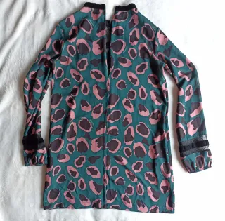 Vestido corto de manga larga con estampado animal print. - Diseño con detalles de encaje y terciopelo. - Cuello redondo. - Puños elásticos.