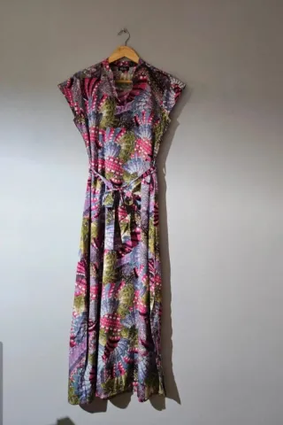 Vestido largo con un estampado vibrante y llamativo. Ideal para lucir un estilo único. - Diseño con cuello en V. - Cinturón a juego para ajustar la silueta. - Mangas cortas. - Largo hasta los tobillos. Nuevo. Sin uso PRECIO NO NEGOCIABLE Hablar conmigo antes de comprar