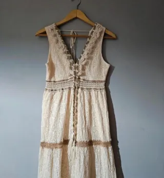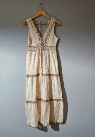 Vestido largo de encaje en color beige. Presenta un diseño con detalles de crochet y tiras. - Escote en V con cordones. - Cintura elástica. - Diseño en capas. - Adornos de crochet en el escote y la cintura. - Tiras de cordón en la parte delantera. Perfecto Estado PRECIO NO NEGOCIABLE Hablar conmigo antes de comprar