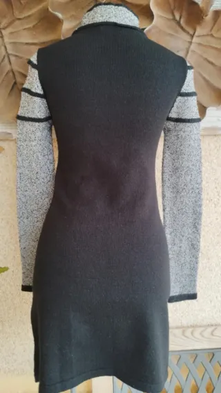 Vestido de punto suave de corte ajustado, ideal para el otoño e invierno. De manga larga, con cuello alto y diseño de rayas negras sobre fondo gris jaspeado, espalda en negro completo. Perfecto para un look casual o para salir. No dice talla siendo adecuado para S/M, comprobar medidas. Referencia visual busto talla M. Con muy poco uso prácticamente nuevo Vestido de malha macia com corte justo, ideal para o outono e inverno. outfit winter, coquette, hiver, abito in morbida lana, vestido punto suave cuello cisne