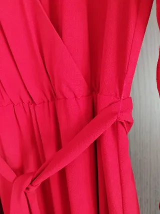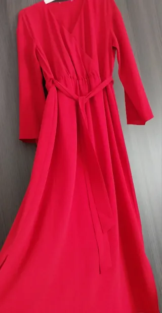 Elegante vestido rojo de Mango con cinturón. - Diseño cruzado. - Cintura elástica. - Manga larga.