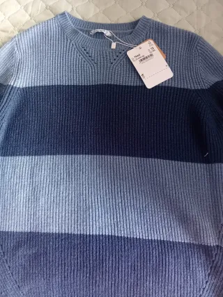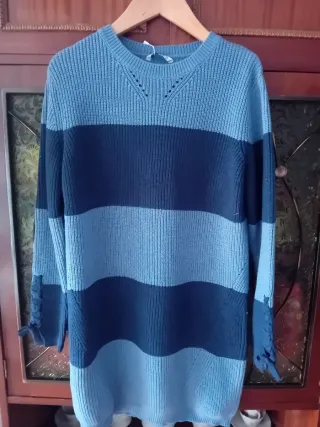 Vestido de punto con un diseño de rayas horizontales en diferentes tonos de azul. Presenta un cuello redondo y mangas largas. - Diseño de rayas onduladas. - Detalle de aberturas en los puños.