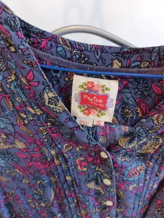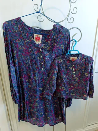 Conjunto de vestido y blusa a juego para madre e hija de la marca Pepita Pérez. Un diseño floral en tonos azules y rosas. La blusa de niña es talla 3-4 años. - Vestido de manga larga. - Cuello redondo con botones. - Estampado floral.