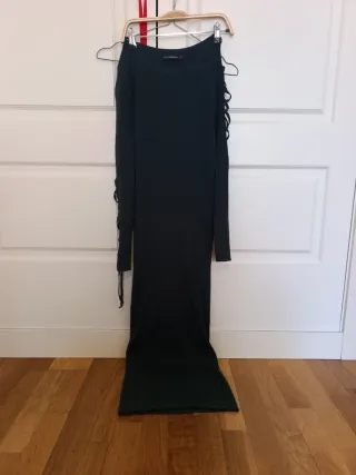 Vestido largo de punto con un diseño moderno y atrevido. - Mangas largas con detalle de cordones. - Corte ajustado. - Largo hasta el tobillo.