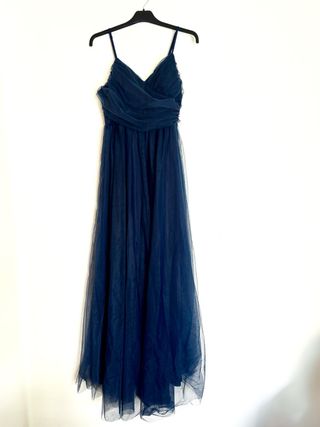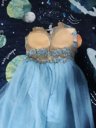 Elegante vestido de fiesta con un diseño de dos piezas. - Cuerpo superior adornado con flores. - Falda larga y vaporosa en tul azul. Se vende vestido utilizando solo una vez en el bautizo de mi hijo. Lo vendo por porque me está grande. Sirve para una talla M/ L. Se prueba en Alcalá de Henares. Lo vendo a mitad de precio.