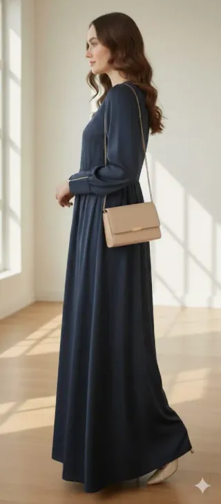 Vestido largo de color azul oscuro , con un diseño elegante y cómodo. - Cuello en V con botones. - Manga corta. - Bajo asimétrico.