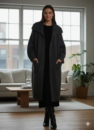 Precioso cardigan largo de punto grueso en color gris oscuro. Es una prenda muy acogedora, perfecta para el otoño e invierno. Su diseño con cuello de solapa ancha y un cinturón que estiliza mucho la figura. Detalles: Corte largo (llega por debajo de la rodilla). Incluye cinturón del mismo tejido para ajustar a la cintura. Dos bolsillos laterales funcionales. Puños y bajo con acabado acanalado (rib). Ideal para looks "Clean Girl" o minimalistas. Combina con todo: vaqueros, vestidos o pantalones de vestir. #cardigan #chaquetadepunto #abrigo #ropainvierno #punto #gris #modamujer #segundamano #oversize #comfy #minimalist #casual #cozy #