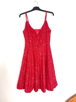 Vestido corto con mucho brillo, perfecto para una ocasión especial. - Diseño con tirantes finos. - Escote pronunciado en V. - Falda con vuelo. - Cierre de cremallera en la espalda. Nuevo sin etiqueta Medidas oficiales (según fabricante): • Pecho: 98 cm • Cintura: 75 cm • Caderas: 152 cm • Largo: 88.5 cm • Talla: L vestido #vestidorojo #lentejuelas #sequins #shein #nuevo #fiesta #nochevieja #boda #invitada #brillo #sexy #elegante #reddress #partylook #prom #tallaL #moda #glam #graduacion