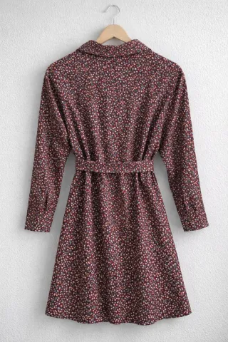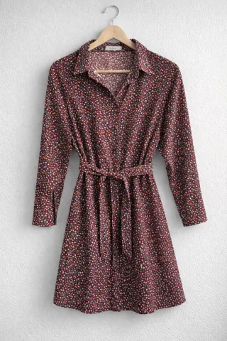 Vestido tipo camisero con estampado floral/micro flores en tonos burdeos/rojo con detalles en verde/crema. ✨ Talla: U (talla única) va desde una 32/38 👗 Manga larga 🎀 Incluye cinturón/lazo para ajustar la cintura (muy favorecedor) ✅ Tejido ligero y cómodo, ideal para entretiempo